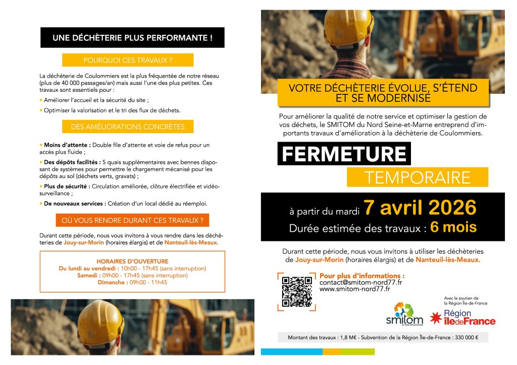 Les usagers se rendant habituellement sur la déchèterie de Coulommiers seront invités à se rendre sur d’autres points du réseau du SMITOM du Nord Seine-et-Marne, selon leur commune de résidence. Les sites de Jouy-sur-Morin, dont les horaires seront élargis pour correspondre à ceux de Coulommiers, de Nanteuil-lès-Meaux ainsi que celui de Bailly-Romainvilliers sont les principaux sites de report.